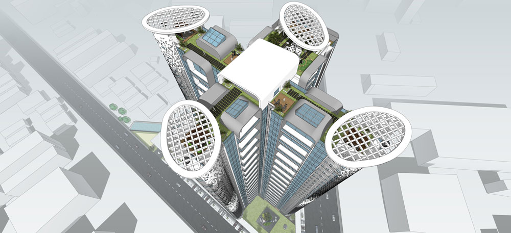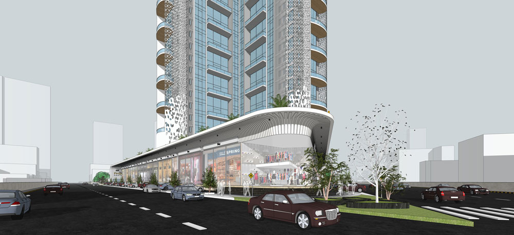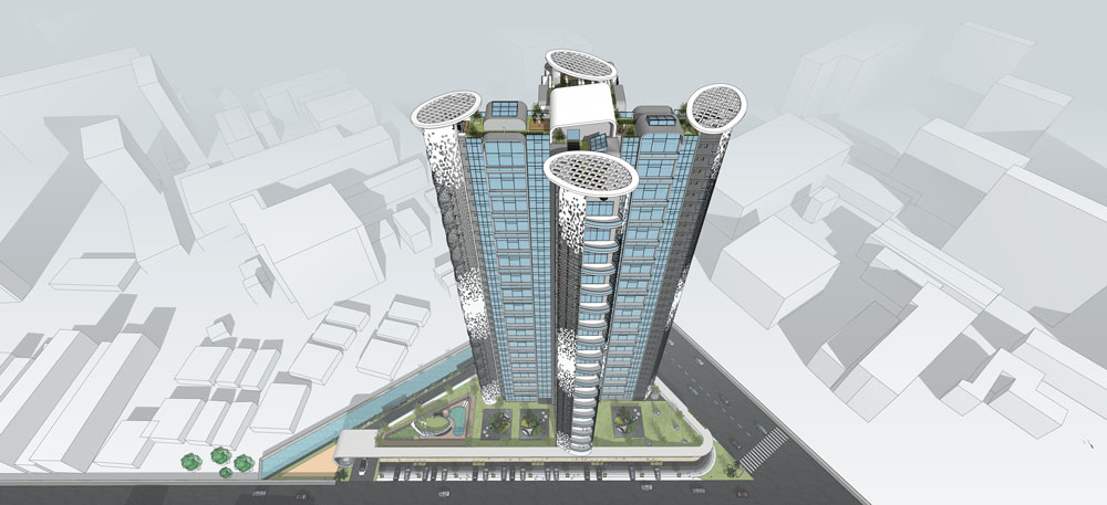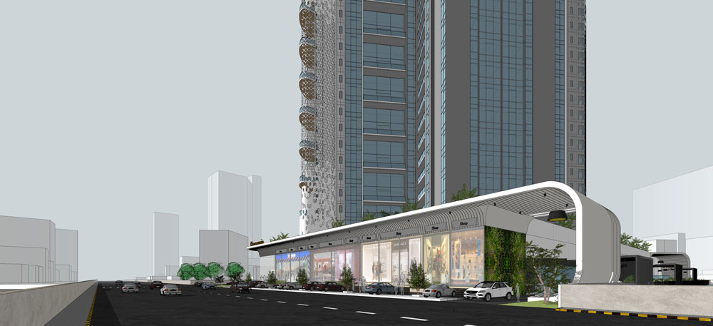 This proposal is designed to create a landmark in Undri, Pune. The project includes two high-rise towers with curved balconies that provide natural shading within the structure. Commercial showrooms have been provided on the ground floor. The towers are designed to be energy-efficient and sustainable. They will be equipped with solar panels and rainwater harvesting systems. The development will also have a green roof, which will help to improve air quality and reduce the heat island effect.